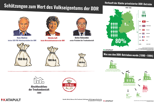 «Ursprünglich, im Sommer 1990, standen rund 8.500 Betriebe in 370 Kombinaten mit über vier Millionen Beschäftigten in den Büchern der Treuhandstelle. (…) Gut drei Viertel der Betriebe ging dabei an westdeutsche Investoren, meist größere Unternehmen. (…) Von den am Ende durch Aufspaltungen entstandenen knapp 12.500 Betriebseinheiten wurden letztlich 53 Prozent privatisiert (…) Die restlichen 30 Prozent wurden schließlich stillgelegt beziehungsweise ‹abgewickelt›. (…) Die Betriebe [hatten] ihr Personal im Laufe der Jahre durch beträchtliche Massenentlassungen erheblich reduziert. Von den ursprünglich vier Millionen Arbeitsplätzen blieben nach der Arbeit der Treuhandanstalt knapp eine Million erhalten. (…) In den frühen Neunzigerjahren fand durch die Hände der Treuhandanstalt eine energische Umwandlung von (DDR-)Volkseigentum in zumeist westdeutsches Privateigentum von immensem Ausmaß statt (…) Während manche Branchen wie Dienstleistungen, Energie, Finanzen, Versicherungen und Verlage als besonders attraktive ‹Perlen› sehr schnell einen westdeutschen Abnehmer fanden, ließen sich für die die DDR-Planwirtschaft dominierenden, klassischen Großindustrien wie beispielsweise Werkzeug- und Maschinenbau, Metallurgie, Chemie, Textil und Werften nur schwer finanzkräftige Investoren aufspüren.»